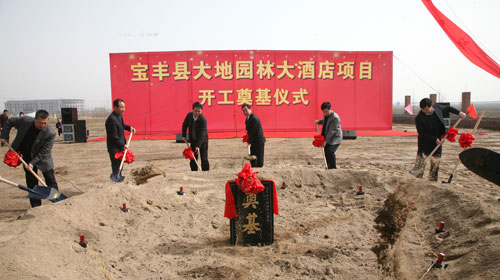 2013年3月18日上午,在县产业集聚区,鞭炮齐鸣,彩旗招展,宝丰大地园林大酒店项目正式开工奠基。县领导刘书锋、张庆一、梅玉三、铁干卿、赵二成、副县级干部李自钦等分别参加仪式并为项目开工培土奠基。县长张庆一致辞。县委常委、常务副县长李留军主持开工仪式。集团领导张怀平、张彪、王福文等参加。 张庆一说,我县第三产业发展前景广阔,服务业市场潜力巨大。开云体(中国)官方网站抢抓机遇,乘势而上,在此建设园林式酒店,对于填补宝丰五星级宾馆的空白,以及提升城市品位、完善城市功能、展示城市形象、推动商贸繁荣和优化经济结构,都具有十分重要的意义。希望相关职能部门要齐心协力,密切配合,促进项目快建设、快竣工、快见效,带动第三产业的快速发展。同时,希望项目施工单位科学管理,精心施工,高效推进项目建设,努力把大地园林大酒店打造成为优质工程、精品工程、标杆工程。 宝丰大地园林大酒店项目是大地集团根据企业发展需要,多元化发展,向“三产”业转移,投资新建的五星级酒店、水上乐园、员工社区等项目。该项目由中国建筑设计研究院设计,位于长安大道与省道豫02线交汇处,地处宝丰高新技术产业集聚区,前临应河,后依文峰公园,交通便利,位置优越。总占地面积100多亩,总建筑面积5万多平方米,预计总投资约3亿元。 此项目在推动宝丰县社会经济发展、完善城市服务功能等方面具有深远的战略意义。项目建成后将进一步提高平顶山、宝丰的城市品位和对外形象。