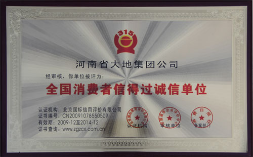 首页 >> 走进大地 >>资质荣誉 >> 全国消费者信得过诚信单位