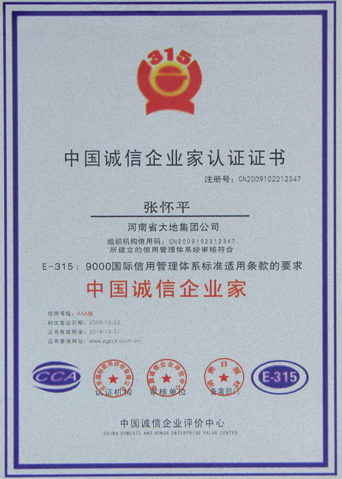 首页 >> 走进大地 >>资质荣誉 >> 中国诚信企业家
