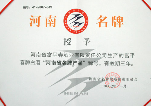 富平春酒获得“河南省名牌产品”